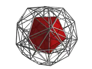 ![]() Perspective projection centered on an icosahedral cell, with 4D viewpoint placed at a distance of 5 times the vertex-center radius. The nearest icosahedral cell is rendered in solid color, and the other cells are in edge-outline. Cells facing away from the 4D viewpoint are culled, to reduce visual clutter. |