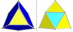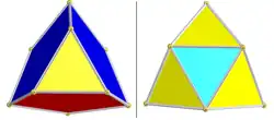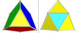 The tetrahedral cells may be divided into two groups, of 96 yellow cells and 24 red cells respectively (as colored in the net illustration). Each yellow tetrahedral cell is joined via its triangular faces to 3 blue icosahedral cells and one red tetrahedral cell, while each red tetrahedral cell is joined to 4 yellow tetrahedra. Thus, the tetrahedral cells occur in clusters of five (four yellow cells face-bonded around a red central one, each red/yellow pair lying in a different hyperplane). The red central tetrahedron of the five shares each of its six edges with a different icosahedral cell, and with the pair of yellow tetrahedral cells which shares that edge on the icosahedral cell.