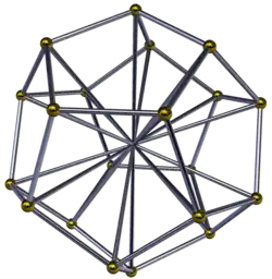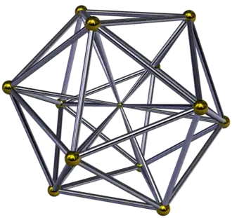 The icosahedral pyramid is a four-dimensional convex polytope, bounded by one icosahedron as its base and by 20 triangular pyramid cells which meet at its apex. Since an icosahedron's circumradius is less than its edge length,[1] the tetrahedral pyramids can be made with regular faces.
