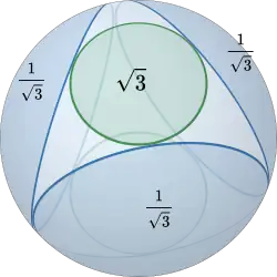Descartes' theorem generalizes to mutually tangent great or small circles in spherical geometry if the curvature of the th circle is defined as the geodesic curvature of the circle relative to the sphere, which equals the cotangent of the oriented intrinsic radius Then:[19][45]