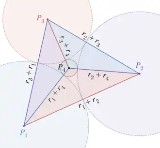 Multiple proofs of the theorem have been published. Steiner's proof uses Pappus chains and Viviani's theorem. Proofs by Philip Beecroft and by H. S. M. Coxeter involve four more circles, passing through triples of tangencies of the original three circles; Coxeter also provided a proof using inversive geometry. Additional proofs involve arguments based on symmetry, calculations in exterior algebra, or algebraic manipulation of Heron's formula (for which see § Soddy circles of a triangle).[23][24] The result also follows from the observation that the Cayley–Menger determinant of the four coplanar circle centers is zero.[25]