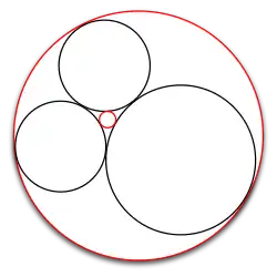 Geometrical problems involving tangent circles have been pondered for millennia. In ancient Greece of the third century BC, Apollonius of Perga devoted an entire book to the topic, Ἐπαφαί [Tangencies]. It has been lost, and is known largely through a description of its contents by Pappus of Alexandria and through fragmentary references to it in medieval Islamic mathematics.[2] However, Greek geometry was largely focused on straightedge and compass construction. For instance, the problem of Apollonius, closely related to Descartes' theorem, asks for the construction of a circle tangent to three given circles which need not themselves be tangent.[3] Instead, Descartes' theorem is formulated using algebraic relations between numbers describing geometric forms. This is characteristic of analytic geometry, a field pioneered by René Descartes and Pierre de Fermat in the first half of the 17th century.[4]