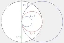 This formula also holds for mutually tangent configurations in hyperbolic geometry including hypercycles and horocycles, if is the geodesic curvature of the cycle relative to the hyperbolic plane, the reciprocal of the stereographic diameter of the cycle. This is the diameter under stereographic projection (the Poincaré disk model) when one endpoint of the diameter is projected to the origin.[48] Hypercycles do not have a well-defined center or intrinsic radius and horocycles have an ideal point for a center and infinite intrinsic radius, but for a hyperbolic circle, for a horocycle, for a hypercycle, and for a geodesic.[49]