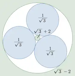 - ↑ Northshield, Sam (2014), "Complex Descartes circle theorem", The American Mathematical Monthly, 121 (10): 927–931, doi:10.4169/amer.math.monthly.121.10.927, hdl:1951/69912, JSTOR 10.4169/amer.math.monthly.121.10.927, MR 3295667