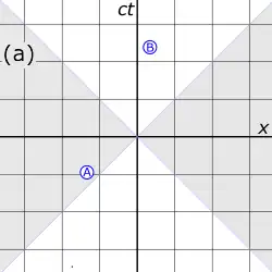 Fig. 3-1d. Since the speed of light is an invariant, the worldlines of two photons passing through the origin at time still plot as 45° diagonal lines. The primed coordinates of and are related to the unprimed coordinates through the Lorentz transformations and could be approximately measured from the graph (assuming that it has been plotted accurately enough), but the real merit of a Minkowski diagram is its granting us a geometric view of the scenario. For example, in this figure, we observe that the two timelike-separated events that had different x-coordinates in the unprimed frame are now at the same position in space.