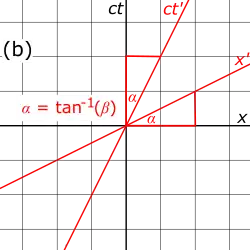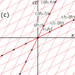 Fig. 3-1c. Units in the primed axes have a different scale from units in the unprimed axes. From the Lorentz transformations, we observe that coordinates of in the primed coordinate system transform to in the unprimed coordinate system. Likewise, coordinates of in the primed coordinate system transform to in the unprimed system. Draw gridlines parallel with the axis through points as measured in the unprimed frame, where is an integer. Likewise, draw gridlines parallel with the axis through as measured in the unprimed frame. Using the Pythagorean theorem, we observe that the spacing between units equals times the spacing between units, as measured in frame S. This ratio is always greater than 1, and ultimately it approaches infinity as