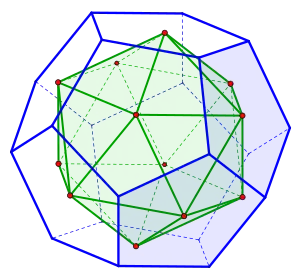 The dual polyhedron of a dodecahedron is the regular icosahedron. One property of the dual polyhedron generally is that the original polyhedron and its dual share the same three-dimensional symmetry group. In the case of the regular dodecahedron, it has the same symmetry as the regular icosahedron, the icosahedral symmetry .[8] The regular dodecahedron has ten three-fold axes passing through pairs of opposite vertices, six five-fold axes passing through the opposite faces centers, and fifteen two-fold axes passing through the opposite sides midpoints.[9]
