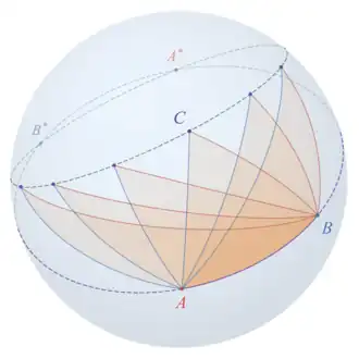 The polar triangle associated with a triangle △ABC is defined as follows. Consider the great circle that contains the side BC. This great circle is defined by the intersection of a diametral plane with the surface. Draw the normal to that plane at the centre: it intersects the surface at two points and the point that is on the same side of the plane as A is (conventionally) termed the pole of A and it is denoted by A'. The points B' and C' are defined similarly.