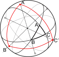The triangle △A'B'C' is the polar triangle corresponding to triangle △ABC. The angles and sides of the polar triangle are given by (Todhunter,[1] Art.27) Therefore, if any identity is proved for △ABC then we can immediately derive a second identity by applying the first identity to the polar triangle by making the above substitutions. This is how the supplemental cosine equations are derived from the cosine equations. Similarly, the identities for a quadrantal triangle can be derived from those for a right-angled triangle. The polar triangle of a polar triangle is the original triangle.