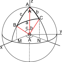 Spherical trigonometry is the branch of spherical geometry that deals with the metrical relationships between the sides and angles of spherical triangles, traditionally expressed using trigonometric functions. On the sphere, geodesics are great circles. Spherical trigonometry is of great importance for calculations in astronomy, geodesy, and navigation.