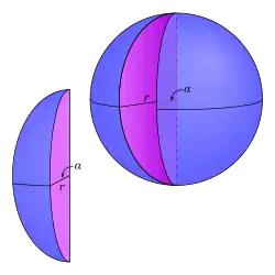 In geometry, a spherical wedge or ungula is a portion of a ball bounded by two plane semidisks and a spherical lune (termed the wedge's base). The angle between the radii lying within the bounding semidisks is the dihedral α. If AB is a semidisk that forms a ball when completely revolved about the z-axis, revolving AB only through a given α produces a spherical wedge of the same angle α.[1] Beman (2008)[2] remarks that "a spherical wedge is to the sphere of which it is a part as the angle of the wedge is to a perigon." [A] A spherical wedge of α = π radians (180°) is called a hemisphere, while a spherical wedge of α = 2π radians (360°) constitutes a complete ball.