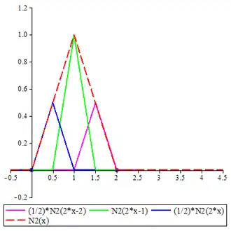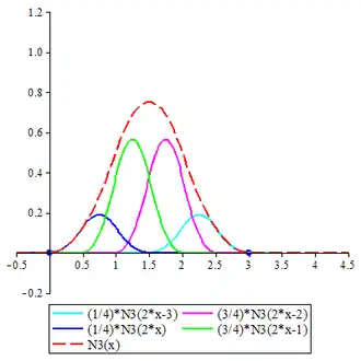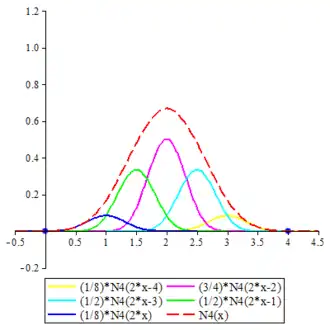 The cardinal B-splines are defined recursively starting from the B-spline of order 1, namely , which takes the value 1 in the interval [0, 1) and 0 elsewhere. Computer algebra systems may have to be employed to obtain concrete expressions for higher order cardinal B-splines. The concrete expressions for cardinal B-splines of all orders up to 6 are given below. The graphs of cardinal B-splines of orders up to 4 are also exhibited. In the images, the graphs of the terms contributing to the corresponding two-scale relations are also shown. The two dots in each image indicate the extremities of the interval supporting the B-spline.