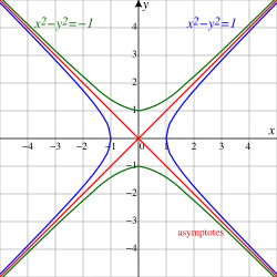is a hyperbola for every nonzero a in The hyperbola consists of a right and left branch passing through (a, 0) and (−a, 0). The case a = 1 is called the unit hyperbola. The conjugate hyperbola is given by