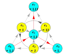 A convenient mnemonic is given by the diagram at the right, which represents the multiplication table for the split-octonions. This one is derived from its parent octonion (one of 480 possible), which is defined by: