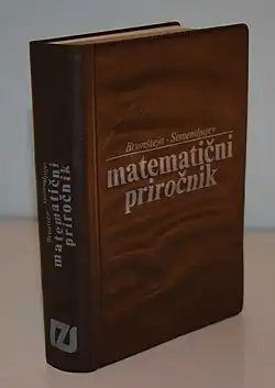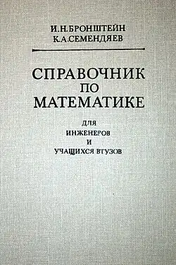 Bronshtein and Semendyayev is a comprehensive handbook of fundamental working knowledge of mathematics and table of formulas based on the Russian book Справочник по математике для инженеров и учащихся втузов (Spravochnik po matematike dlya inzhenerov i uchashchikhsya vtuzov, literally: "Handbook of mathematics for engineers and students of technical universities") compiled by the Russian mathematician Ilya Nikolaevich Bronshtein (Илья Николаевич Бронштейн)[nb 1] and engineer Konstantin Adolfovic Semendyayev (Константин Адольфович Семендяев).[4][nb 2]