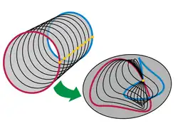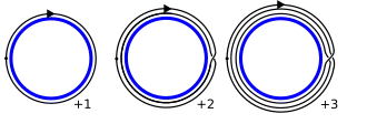 The simplest case concerns the ways that a circle (1-sphere) can be wrapped around another circle. This can be visualized by wrapping a rubber band around one's finger: it can be wrapped once, twice, three times and so on. The wrapping can be in either of two directions, and wrappings in opposite directions will cancel out after a deformation. The homotopy group π1(S1) is therefore an infinite cyclic group, and is isomorphic to the group Z of integers under addition: a homotopy class is identified with an integer by counting the number of times a mapping in the homotopy class wraps around the circle. This integer can also be thought of as the winding number of a loop around the origin in the plane.[9]