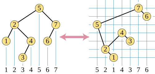 Stack-sortable permutations may also be translated directly to and from (unlabeled) binary trees, another combinatorial class whose counting function is the sequence of Catalan numbers. A binary tree may be transformed into a stack-sortable permutation by numbering its nodes in left-to-right order, and then listing these numbers in the order they would be visited by a preorder traversal of the tree: the root first, then the left subtree, then the right subtree, continuing recursively within each subtree. In the reverse direction, a stack-sortable permutation may be decoded into a tree in which the first value x of the permutation corresponds to the root of the tree, the next x − 1 values are decoded recursively to give the left child of the root, and the remaining values are again decoded recursively to give the right child.[1]