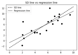 In statistics, the standard deviation line (or SD line) marks points on a scatter plot that are an equal number of standard deviations away from the average in each dimension. For example, in a 2-dimensional scatter diagram with variables and , points that are 1 standard deviation away from the mean of and also 1 standard deviation away from the mean of are on the SD line.[1] The SD line is a useful visual tool since points in a scatter diagram tend to cluster around it,[1] more or less tightly depending on their correlation.