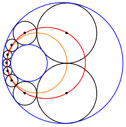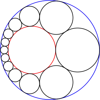 In geometry, a Steiner chain is a set of n circles, all of which are tangent to two given non-intersecting circles (blue and red in Figure 1), where n is finite and each circle in the chain is tangent to the previous and next circles in the chain. In the usual closed Steiner chains, the first and last (n-th) circles are also tangent to each other; by contrast, in open Steiner chains, they need not be. The given circles α and β do not intersect, but otherwise are unconstrained; the smaller circle may lie completely inside or outside of the larger circle. In these cases, the centers of Steiner-chain circles lie on an ellipse or a hyperbola, respectively.