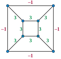 László Lovász has shown a correspondence between polyhedral representations of graphs and matrices realizing the Colin de Verdière graph invariants of the same graphs. The Colin de Verdière invariant is the maximum corank of a weighted adjacency matrix of the graph, under some additional conditions that are irrelevant for polyhedral graphs. These are square symmetric matrices indexed by the vertices, with the weight of vertex in the diagonal coefficient and with the weight of edge in the off-diagonal coefficients and . When vertices and are not adjacent, the coefficient is required to be zero. This invariant is at most three if and only if the graph is a planar graph. As Lovász shows, when the graph is polyhedral, a representation of it as a polyhedron can be obtained by finding a weighted adjacency matrix of corank three, finding three vectors forming a basis for its nullspace, using the coefficients of these vectors as coordinates for the vertices of a polyhedron, and scaling these vertices appropriately.[45]