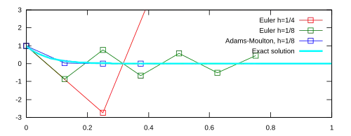 3. The trapezoidal method (that is, the two-stage Adams–Moulton method) is given by where . Applying this method instead of Euler's method gives a much better result (blue). The numerical results decrease monotonically to zero, just as the exact solution does.