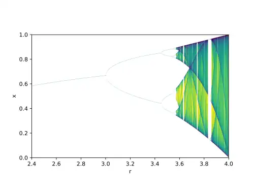 The parameters of a dynamic equation evolve as the equation is iterated, and the specific values may depend on the starting parameters. An example is the well-studied logistic map, , whose basins of attraction for various values of the parameter are shown in the figure. If , all starting values of will rapidly lead to function values that go to negative infinity; starting values of will also go to negative infinity. But for the values rapidly converge to , i.e. at this value of , a single value of is an attractor for the function's behaviour. For other values of , more than one value of may be visited: if is 3.2, starting values of will lead to function values that alternate between and . At some values of , the attractor is a single point (a "fixed point"), at other values of two values of are visited in turn (a period-doubling bifurcation), or, as a result of further doubling, any number values of ; at yet other values of , any given number of values of are visited in turn; finally, for some values of , an infinitude of points are visited. Thus one and the same dynamic equation can have various types of attractors, depending on its parameters.