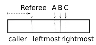 A referee moves a sword from left to right over the cake, hypothetically dividing it into small left piece and a large right piece. Each player moves a knife over the right piece, always keeping it parallel to the sword. The players must move their knives in a continuous manner, without making any "jumps".[4] When any player shouts "cut", the cake is cut by the sword and by whichever of the players' knives happens to be the central one of the three (that is, the second in order from the sword). Then the cake is divided in the following way: