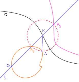 In geometry, a strophoid is a curve generated from a given curve C and points A (the fixed point) and O (the pole) as follows: Let L be a variable line passing through O and intersecting C at K. Now let P1 and P2 be the two points on L whose distance from K is the same as the distance from A to K (i.e. KP1 = KP2 = AK). The locus of such points P1 and P2 is then the strophoid of C with respect to the pole O and fixed point A. Note that AP1 and AP2 are at right angles in this construction.