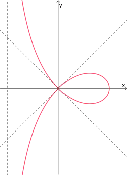 The curve resembles the Folium of Descartes[1] and the line x = –a is an asymptote to two branches. The curve has two more asymptotes, in the plane with complex coordinates, given by