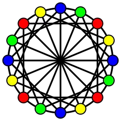 A non-optimal subcoloring with four colors. Merging the red and blue colors, and the green and yellow colors, produces a subcoloring with only two colors.