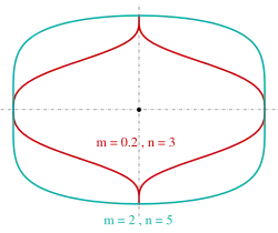 For two-dimensional case the equation is where either equals to or differs from . If , it is the Lamé's superellipses. If , the curve possesses more flexibility of behavior, and is better possible fit to describe some experimental information.[11]