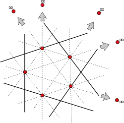 The question of the existence of an ordinary line can also be posed for points in the real projective plane RP2 instead of the Euclidean plane. The projective plane can be formed from the Euclidean plane by adding extra points "at infinity" where lines that are parallel in the Euclidean plane intersect each other, and by adding a single line "at infinity" containing all the added points. However, the additional points of the projective plane cannot help create non-Euclidean finite point sets with no ordinary line, as any finite point set in the projective plane can be transformed into a Euclidean point set with the same combinatorial pattern of point-line incidences. Therefore, any pattern of finitely many intersecting points and lines that exists in one of these two types of plane also exists in the other. Nevertheless, the projective viewpoint allows certain configurations to be described more easily. In particular, it allows the use of projective duality, in which the roles of points and lines in statements of projective geometry can be exchanged for each other. Under projective duality, the existence of an ordinary line for a set of non-collinear points in RP2 is equivalent to the existence of an ordinary point in a nontrivial arrangement of finitely many lines. An arrangement is said to be trivial when all its lines pass through a common point, and nontrivial otherwise; an ordinary point is a point that belongs to exactly two lines.[2]