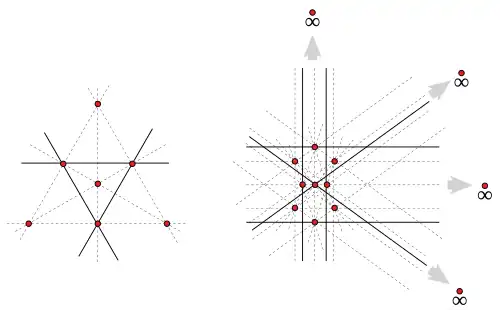 The Sylvester–Gallai theorem also does not directly apply to geometries in which points have coordinates that are pairs of complex numbers or quaternions, but these geometries have more complicated analogues of the theorem. For instance, in the complex projective plane there exists a configuration of nine points, Hesse's configuration (the inflection points of a cubic curve), in which every line is non-ordinary, violating the Sylvester–Gallai theorem. Such a configuration is known as a Sylvester–Gallai configuration, and it cannot be realized by points and lines of the Euclidean plane. Another way of stating the Sylvester–Gallai theorem is that whenever the points of a Sylvester–Gallai configuration are embedded into a Euclidean space, preserving colinearities, the points must all lie on a single line, and the example of the Hesse configuration shows that this is false for the complex projective plane. However, Kelly (1986) proved a complex-number analogue of the Sylvester–Gallai theorem: whenever the points of a Sylvester–Gallai configuration are embedded into a complex projective space, the points must all lie in a two-dimensional subspace. Equivalently, a set of points in three-dimensional complex space whose affine hull is the whole space must have an ordinary line, and in fact must have a linear number of ordinary lines.[21] Similarly, Elkies, Pretorius & Swanepoel (2006) showed that whenever a Sylvester–Gallai configuration is embedded into a space defined over the quaternions, its points must lie in a three-dimensional subspace.