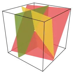 For three variables, each linear equation determines a plane in three-dimensional space, and the solution set is the intersection of these planes. Thus the solution set may be a plane, a line, a single point, or the empty set. For example, as three parallel planes do not have a common point, the solution set of their equations is empty; the solution set of the equations of three planes intersecting at a point is single point; if three planes pass through two points, their equations have at least two common solutions; in fact the solution set is infinite and consists in all the line passing through these points.[6]