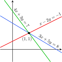 It must be kept in mind that the pictures above show only the most common case (the general case). It is possible for a system of two equations and two unknowns to have no solution (if the two lines are parallel), or for a system of three equations and two unknowns to be solvable (if the three lines intersect at a single point).