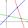 are not independent, because the third equation is the sum of the other two. Indeed, any one of these equations can be derived from the other two, and any one of the equations can be removed without affecting the solution set. The graphs of these equations are three lines that intersect at a single point.