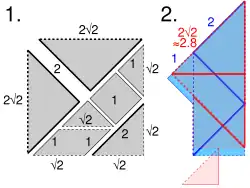 Choosing a unit of measurement so that the seven pieces can be assembled to form a square of side one unit and having area one square unit, the seven pieces are:[29]