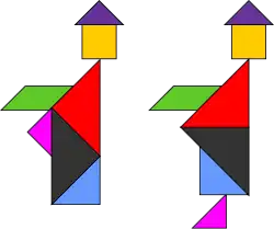 A tangram paradox is a dissection fallacy: Two figures composed with the same set of pieces, one of which seems to be a proper subset of the other.[21] One famous paradox is that of the two monks, attributed to Henry Dudeney, which consists of two similar shapes, one with and the other missing a foot.[22] In reality, the area of the foot is compensated for in the second figure by a subtly larger body.