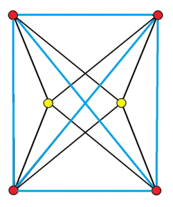 ![]() Orthogonal projection. 4 red vertices and 6 blue edges make central tetrahedron. 2 yellow vertices are bipyramid apexes. | ||