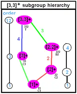T, 332, [3,3]+, or 23, of order 12 – chiral or rotational tetrahedral symmetry. There are three orthogonal 2-fold rotation axes, like chiral dihedral symmetry D2 or 222, with in addition four 3-fold axes, centered between the three orthogonal directions. This group is isomorphic to A4, the alternating group on 4 elements; in fact it is the group of even permutations of the four 3-fold axes: e, (123), (132), (124), (142), (134), (143), (234), (243), (12)(34), (13)(24), (14)(23).