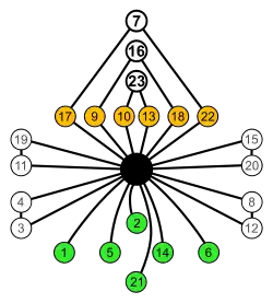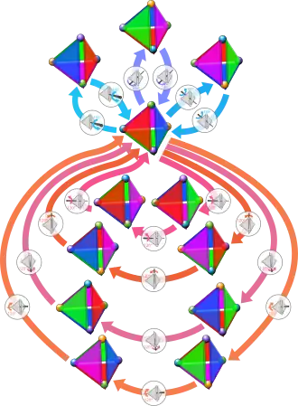 ![]() A tetrahedron can be placed in 12 distinct positions by rotation alone. These are illustrated above in the cycle graph format, along with the 180° edge (blue arrows) and 120° vertex (reddish arrows) rotations that permute the tetrahedron through those positions. |