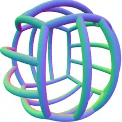 Th, 3*2, [4,3+] or m3, of order 24 – pyritohedral symmetry.[1] This group has the same rotation axes as T, with mirror planes through two of the orthogonal directions. The 3-fold axes are now S6 (3) axes, and there is a central inversion symmetry. Th is isomorphic to T × Z2: every element of Th is either an element of T, or one combined with inversion. Apart from these two normal subgroups, there is also a normal subgroup D2h (that of a cuboid), of type Dih2 × Z2 = Z2 × Z2 × Z2. It is the direct product of the normal subgroup of T (see above) with Ci. The quotient group is the same as above: of type Z3. The three elements of the latter are the identity, "clockwise rotation", and "anti-clockwise rotation", corresponding to permutations of the three orthogonal 2-fold axes, preserving orientation.