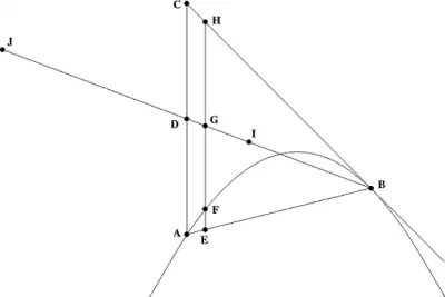 Suppose the line segment AC is parallel to the axis of symmetry of the parabola. Further suppose that the line segment BC lies on a line that is tangent to the parabola at B. The first proposition states:[1]: 14