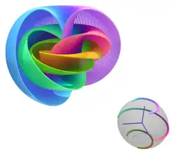 The Hopf fibration can be visualized using a stereographic projection of S3 to R3 and then compressing R3 to a ball. This image shows points on S2 and their corresponding fibers with the same color.