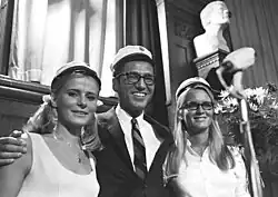 Lehrer toured Sweden, Norway and Denmark in 1967;[48] his concert in Oslo was recorded for Danish television and subsequently released on DVD some 40 years later.[49] He performed as a prominent international guest at the Studenterforeningen (student association) in Copenhagen, which was televised, and he commented on stage that he might be America's "revenge for Victor Borge".[50] He performed original songs in a Dodge automobile industrial film distributed primarily to automobile dealers and shown at promotional events in 1967, set in a fictional American wild west town and titled The Dodge Rebellion Theatre presents Ballads For '67.[28][51] He attempted to adapt Sweeney Todd as a Broadway musical, working with Joe Raposo, to star Jerry Colonna. They started a few songs but, as Lehrer noted, "Nothing ever came of it, and of course twenty years later Stephen Sondheim beat me to the punch."[52]