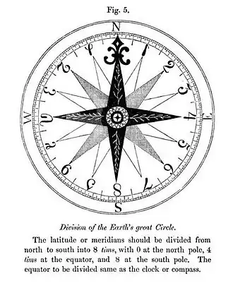 For latitudes he put 0 at the North Pole, 4 at the equator and 8 at the South Pole. The units were called tims. They are the same as the colatitudes measured in turns times 16.