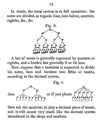 In his book he made a reference to music notation, where binary division is already in use for time. He also discussed the problem of pitch inflation, which he proposed to solve by setting the A below middle C to a frequency of san per timmill (194 Hz).