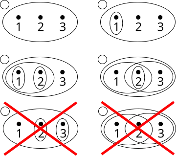 Let be denoted with the circles, here are four examples and two non-examples of topologies on the three-point set The bottom-left example is not a topology because the union of and [i.e. ] is missing; the bottom-right example is not a topology because the intersection of and [i.e. ], is missing.
