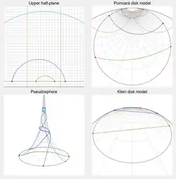 In some sources that use the hyperboloid model of the hyperbolic plane, the hyperboloid is referred to as a pseudosphere.[8] This usage of the word is because the hyperboloid can be thought of as a sphere of imaginary radius, embedded in a Minkowski space.