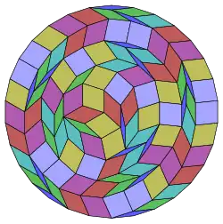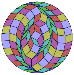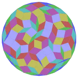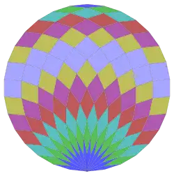 Coxeter states that every zonogon (a 2m-gon whose opposite sides are parallel and of equal length) can be dissected into m(m-1)/2 parallelograms.[4] In particular this is true for regular polygons with evenly many sides, in which case the parallelograms are all rhombi. For the regular triacontagon, m=15, it can be divided into 105: 7 sets of 15 rhombs. This decomposition is based on a Petrie polygon projection of a 15-cube.